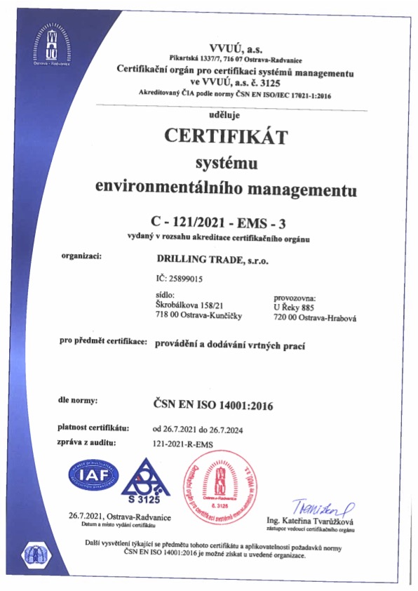 CERTIFIKACE A POLITIKA SPOLEČNOSTI PŘEDMĚT CERTIFIKACE: provádění a dodávání vrtných a geologických prací, výstavba pozemních a inženýrských staveb, ostatních stavebních činností, stavebně montážních prací, dokončovacích stavebních prací. projektování a vyhodnocování geologických prací v oblasti hydrogeologie a sanační geologie dle normy: ČSN EN ISO 9001:2016 ČSN EN ISO 14001:2016 ČSN ISO 45001:2018 platnost certifikace: do 26.7.2024 CERTIFIKACE systém managementu kvality Certifikát ke stažení zde. systém environmentálního managementu Certifikát ke stažení zde. systém managementu bezpečnosti a ochrany zdraví při práci Certifikát ke stažení zde. POLITIKA SPOLEČNOSTI